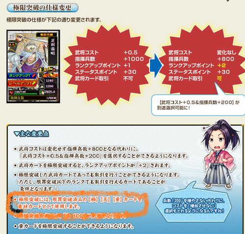来期の仕様変更、天限突破の内容が明らかになりましたね。 まずは極限突破の仕様変更。 コストを選べるのはナイスですよね~。 部隊コスト依存スキル部隊はどんどんコストを上げたいけど、覇本願寺部隊や覇明智等コストを上げにくい武将もいたので、その辺の…
