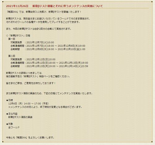 合戦お疲れさまでした。 βテストの告知が来ましたね。 来期も続くようでよかったです^^ 私もあと1年は今のペースで続けられそうなので、ixaが先に終わっちゃうのは勘弁してほしいなあと思っていましたので^^; 1年後は転職すべきなのか迷っているんで…