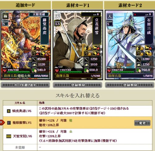 念願の2枚目の今川をゲットでき、さっそく盟主戦用部隊の育成に取り掛かりました。 まずは特殊合成を。 入手した復刻今川を極限突破した後、極限突破させる必要がなかったことに気付き後悔。。。もとの今川は天限突破させていたため、復刻今川はまったくラン…