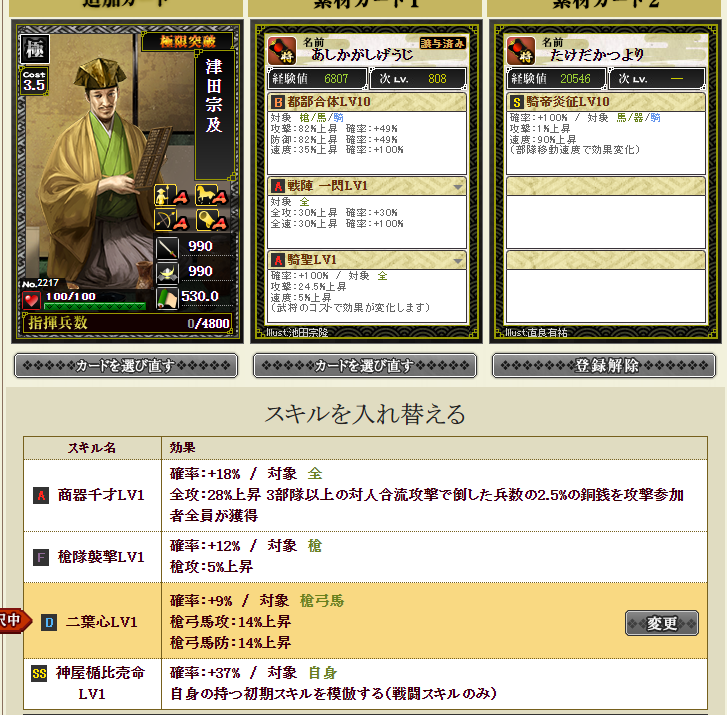 コラボ井伊直虎を引っ張り出し鍾馗ノ化身を狙うわけですが、これまたCを出すために再起ノ智勇を持っている南部さんを幻交換所から交換しました。