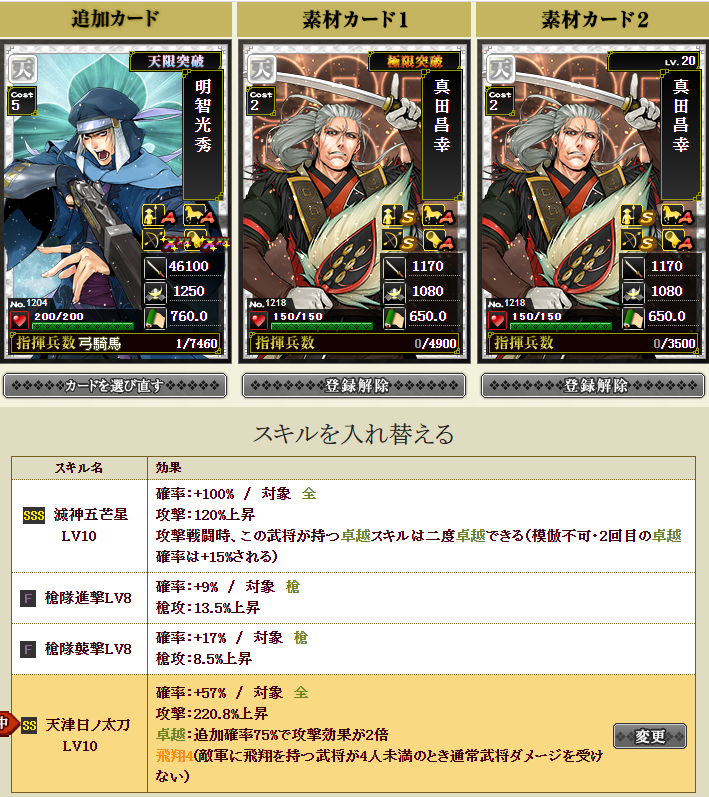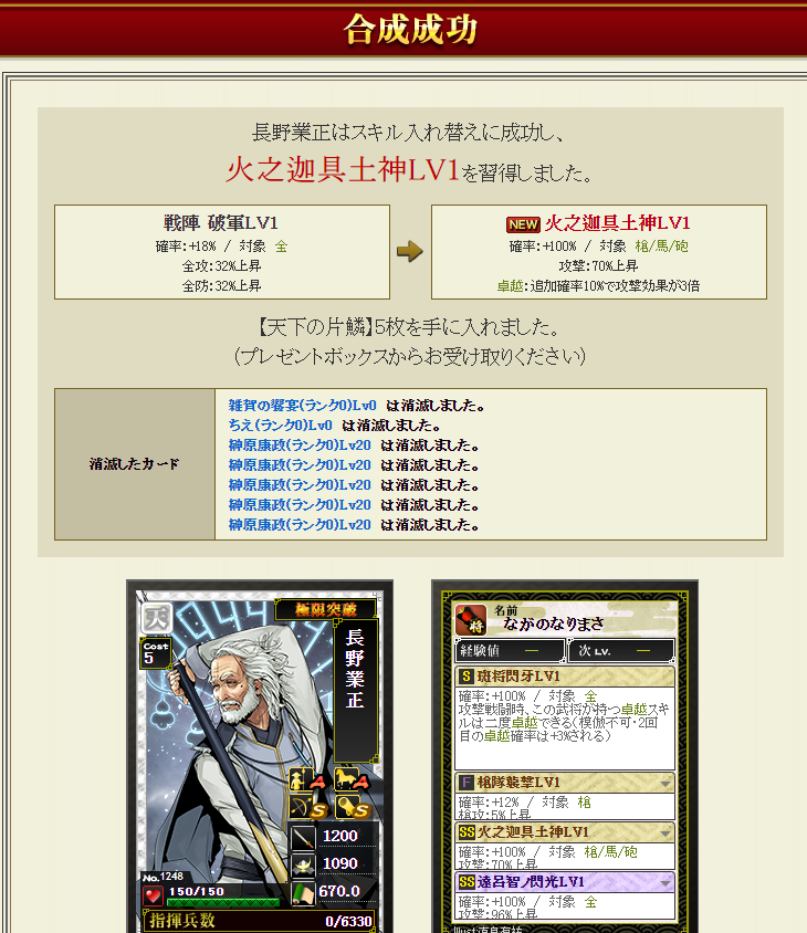 とりあえず、影城主で運よく新天長野がゲットできたので、本城主の卓越部隊をパワーアップさせようと思い、それに向けて動こうと思い合成をちまちま始めることとしました。