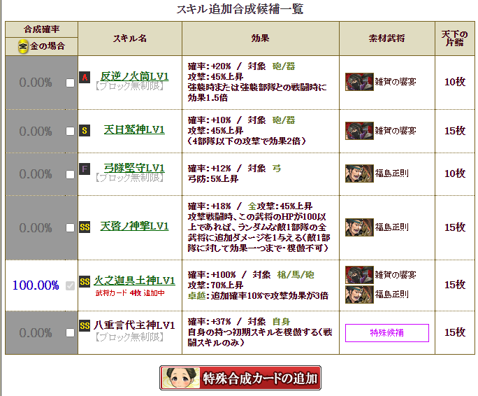 天・童はさすがに貴重なので、特極武将で調整し上記の確率でトライ!