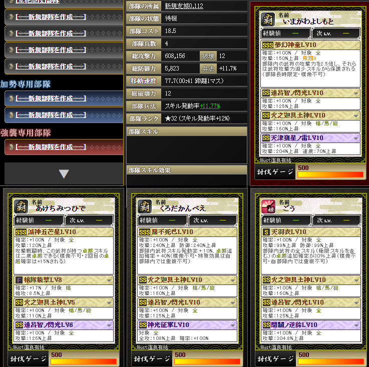 ここからどうするかいろいろ考えたのですが、天を使って遠呂智を狙うよりは極武将から戦陣神楽を活かしてちまちまチャレンジしてみようと思い、ちまちま作業を開始しました。