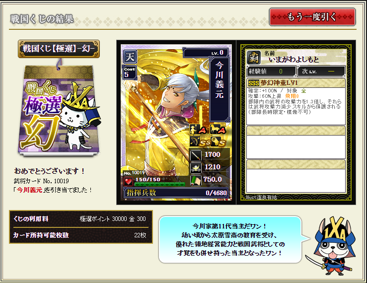 ということで、自ら厳選した武将から引いたくじなのでハズレはないのはまあわかりますが、それでも三浦按針・藤堂高虎・今川義元という私にとっては大当たり武将をゲットでき大満足の結果となりました。